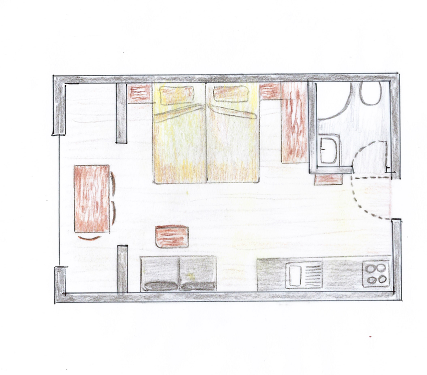 Angolo cottura completamente attrezzata con piatti in ceramica, angolo pranzo, forno, bollitore, macchina da caffè e lavastoviglie, TV satellitare, connessione internet Wi-Fi e cassaforte. Monolocale con letto matrimoniale e divano letto. Bagno e asciugacapelli. Bersò con serratura parete scorrevole in vetro per tutte le stagioni